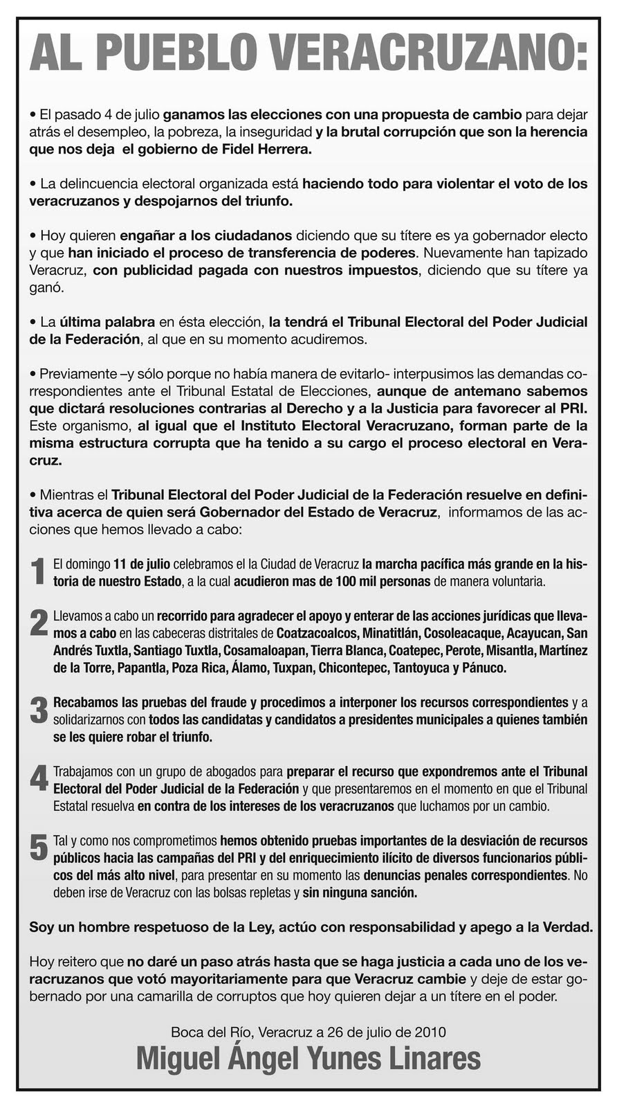 Dicen que en Veracruz hay libertad de expresión, yo creo que sí, el día de hoy, los medios que reciben subsidio del gobierno del estado, no publicaron, ni pagada, la siguiente carta de Miguel Ángel Yunes Linares.