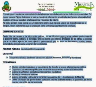 ESTRATEGIAS: Difundir entre los ciudadanos el conocimiento del derecho al acceso a la información pública, Capacitar a los servidores públicos en materia de trasparencia y acceso a la información, Mejorar la calificación otorgada por las instancias reguladoras, Establecer módulos de atención, Mejorar, consolidar y alimentar el portal de transparencia del H. Ayuntamiento de Misantla, Definir un modelo de gestión donde consulte e informe pertinentemente a la población, se rindan cuentas y se actúe con transparencia”. Cabe destacar que está a la fecha el portal oficial del ayuntamiento a la fecha no es vigente, su portal está visto que no encierra nada de lo que dicta en fecha citada, por lo que se informó que la última actualización data del mes de octubre del 2014.