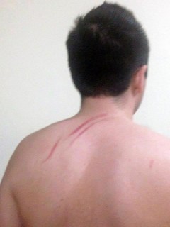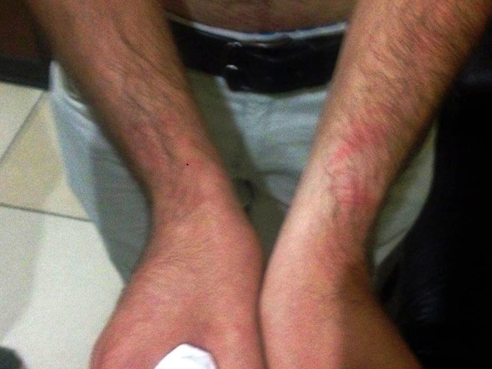 Además de que no existe historial de infracciones en su contra. Del mismo lugar le llamé a mi hijo por teléfono y me dijo que estaba detenido en la policía y que había sido golpeado por un policía, quien lo tiró a la carretera, le puso la bota en la cabeza y le pegó dos patadas en la espalda, y lo encañonó en la cabeza cortándole cartucho a su arma y finalmente lo esposó.