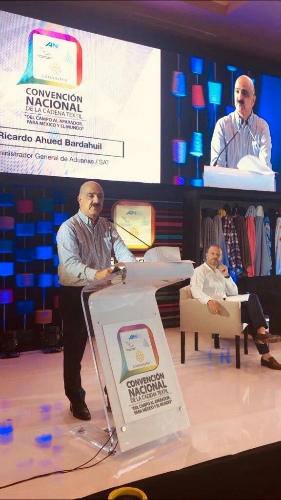 Puerto Morelos, Quintana Roo.- En el marco de la convención nacional de la Industria Textil que une a la Cadena desde el algodón, fibras, textil, confección y calzado, celebrada en municipio de Puerto Morelos, Quintana Roo, el administrador general de aduanas, Ricardo Ahued Bardahuil, participó como panelista, donde reconoció la importancia de esta industria y que es palanca de desarrollo y fundamental en la generación de empleos. Por ello trabajando coordinadamente con la Dra. Margarita Rios Farjat, jefa del SAT, la secretaria de economía, y las instituciones de seguridad del estado mexicano, se han logrado avances significativos en materia de contrabando técnico, inexacta clasificación arancelaria, sub valuación, empresas fachada, entre otros.