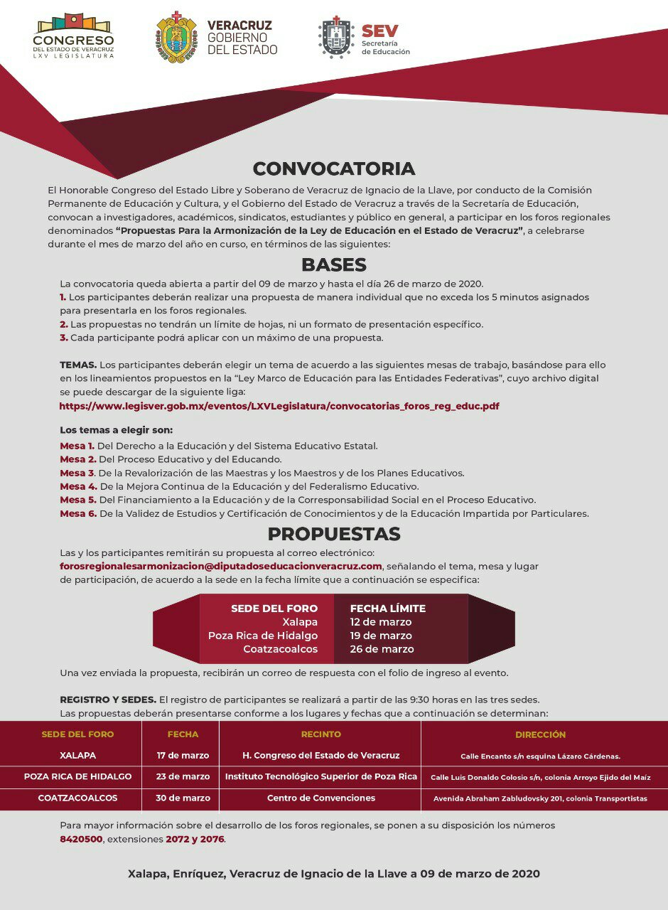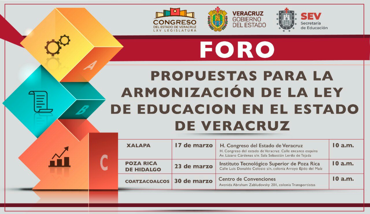 Finalmente, indicaron que los Foros Regionales “Propuestas Para la Armonización de la Ley de Educación en el Estado de Veracruz”, se celebrarán el 17 de marzo en Xalapa, en el Congreso del Estado; el 19 en Poza Rica de Hidalgo en el Instituto Tecnológico Superior de Poza Rica y el 26 en Coatzacoalcos en el Centro de Convenciones, para más información se puso a disposición el numero 8420500 extensiones 2072 y 2076.