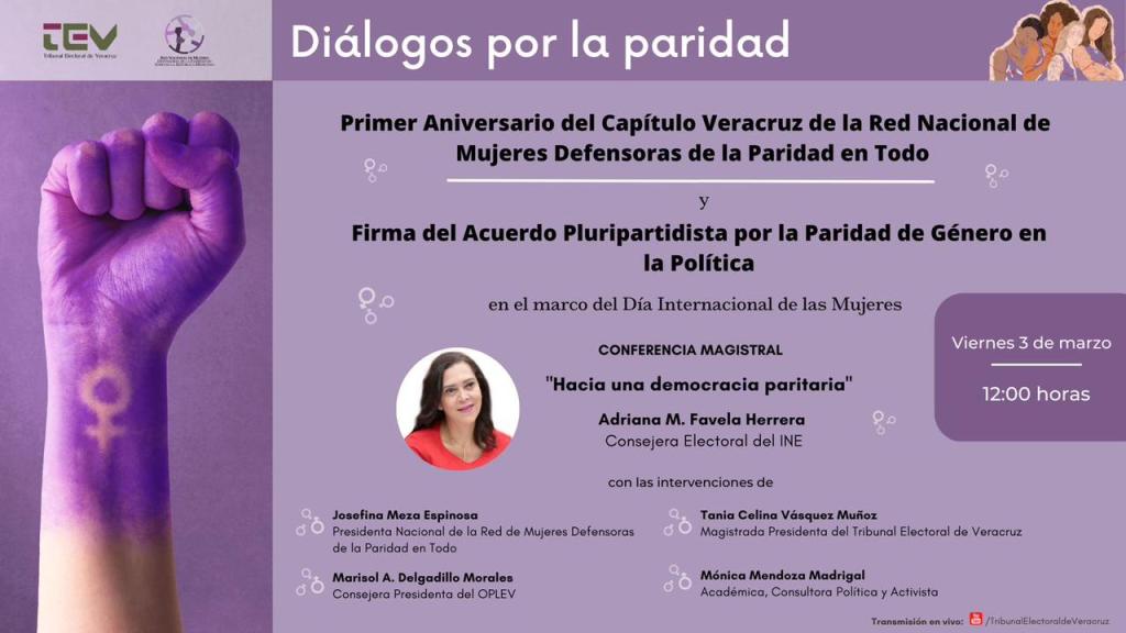 El Capítulo Veracruz de la Red Nacional de Mujeres Defensoras de la Paridad en Todo cumple su 1er Aniversario y para celebrarlo, les invitamos a la conferencia magistral que impartirá la Consejera Electoral del INE, Dra. Adriana Favela inaugurando con su participación el ciclo Diálogos por la Paridad que organizamos en forma conjunta el Capítulo Veracruz, el Tribunal Electoral y el Ople Veracruz.