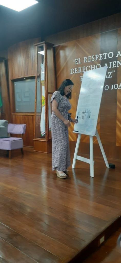 Este importante evento fue organizado por el Tribunal Electoral de Veracruz -TEV- y el Capítulo de Veracruz de la Red Nacional de Mujeres Defensoras de la Paridad en Todo, fue en este marco en la que se llevó a cabo la Firma del Acuerdo Pluripartidista por la Paridad de Género en la Política, donde la Diputada acompañó a Jennifer Yoice García Esquivel, Secretaría de Mujeres del Comité Ejecutivo Estatal del Movimiento de Regeneración Nacional -MORENA-, Veracruz.