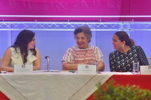 Acompañada de Arianna Angeles Aguirre, secretaria general del CDE y diputada local, quien dio la bienvenida, y Anilu Ingram Vallines, diputada local coordinadora del Grupo Parlamentario del PRI, quien leyó la semblanza de la Senadora, Beatriz Paredes compartió anécdotas de su trayectoria política y respondió cuestionamientos de las mujeres asistentes, a quienes puntualizó que deben diferenciar lo que es política y lo que es poder.