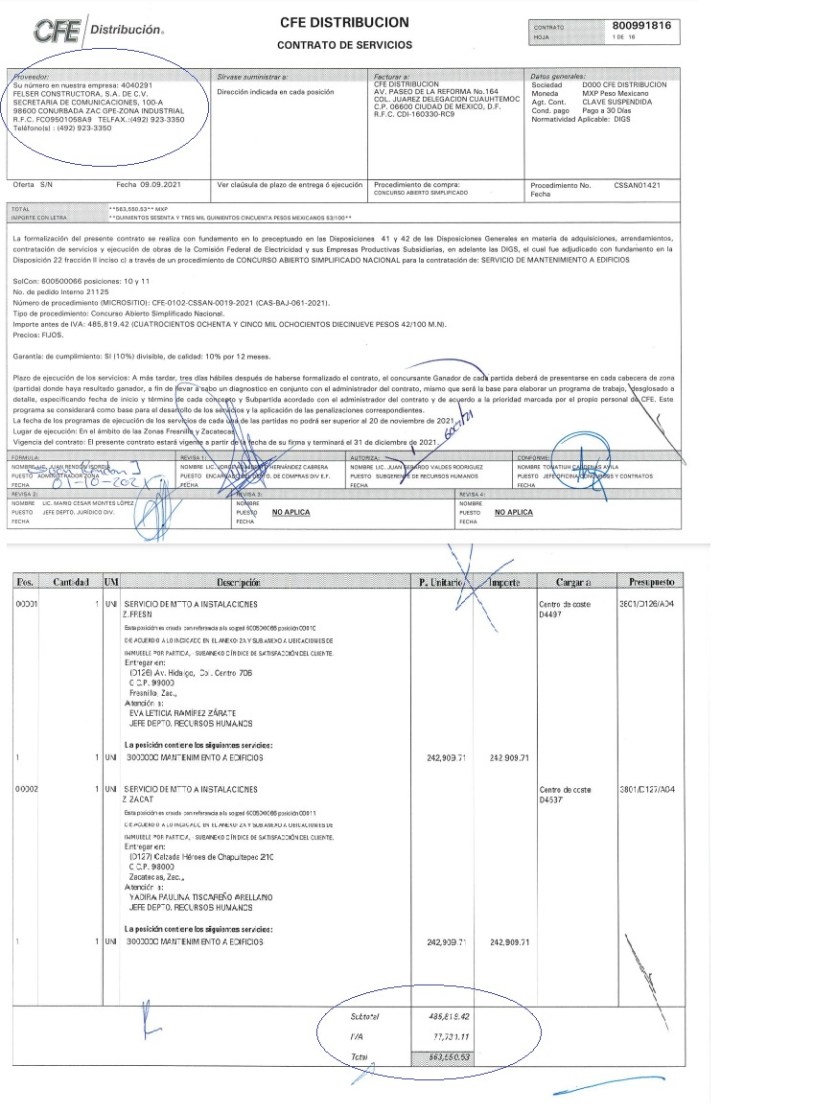 El contrato (No. 800991816), obtenido por “concurso simplificado nacional”, fue por el “servicio de mantenimiento de instalaciones en la zona de Fresnillo”, y tuvo una asignación de 563 mil pesos.