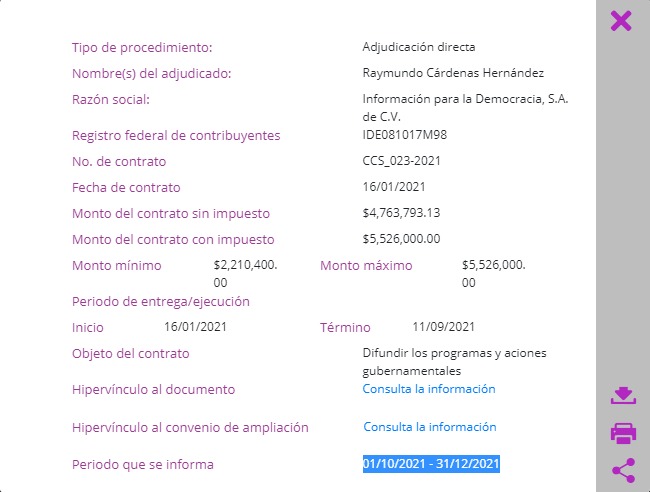 El contrato cubría de enero a septiembre de ese año, pero la Plataforma Nacional de Transparencia reporta transferencias a la empresa todavía en el periodo octubre diciembre de 2021, ya durante el período de gobierno de David Monreal Ávila.