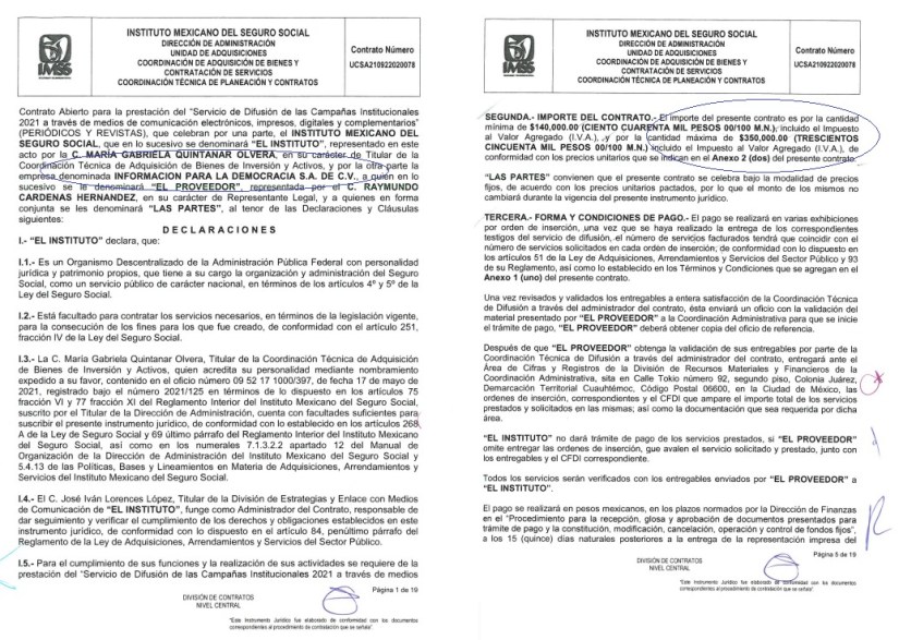 Por ejemplo, en 2019, la Secretaría de Gobernación que encabezaba entonces Olga Sánchez Cordero, asignó un contrato (No. 4500018448) con valor de medio millón pesos, por los servicios de “difusión en radio, medios impresos, medios digitales y medios complementarios para la campaña: ‘Derechos humanos”, versión: “Estrategia Nacional de Lectura”.