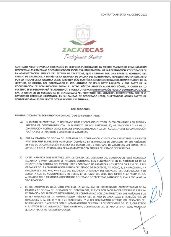 Con la Jefatura de la Oficina del Gobernador priísta Alejandro Tello Cisterna, Información para la Democracia firmó en 2021 un contrato (No. IDE081017M98) por 5.5 millones de pesos por “servicios publicitarios referentes a las campañas de comunicación social y gubernamental de las dependencias y entidades de la administración pública del estado de Zacatecas”.