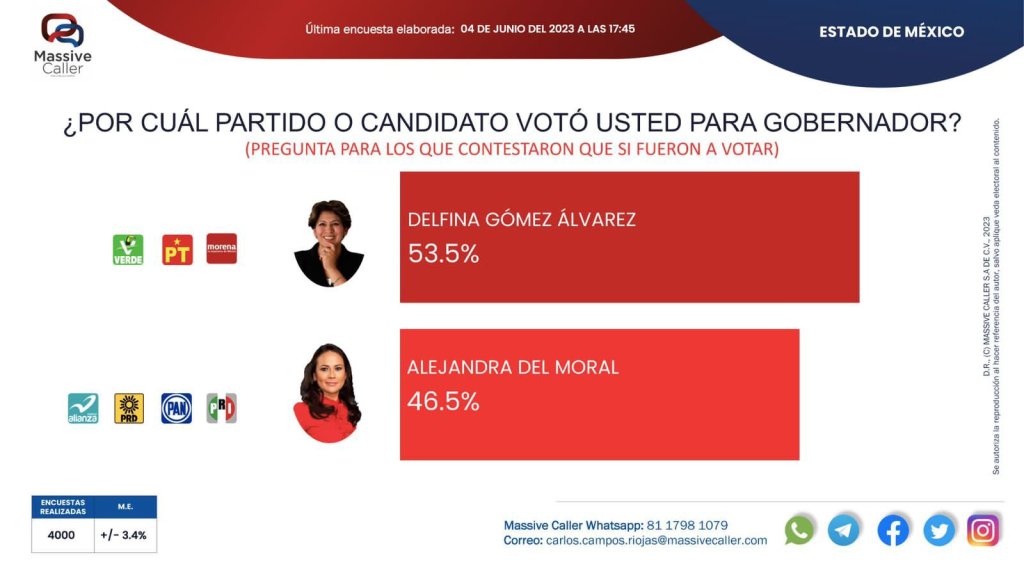 Una de las encuestas de salida, mencionada en su discurso «del triunfo», por Mario Delgado, da una ventaja de 53.5 contra 46.5 de Alejandra, obviamente, la encuestadora que lo dice es Masive Caller, la encuestadora de Morena.
