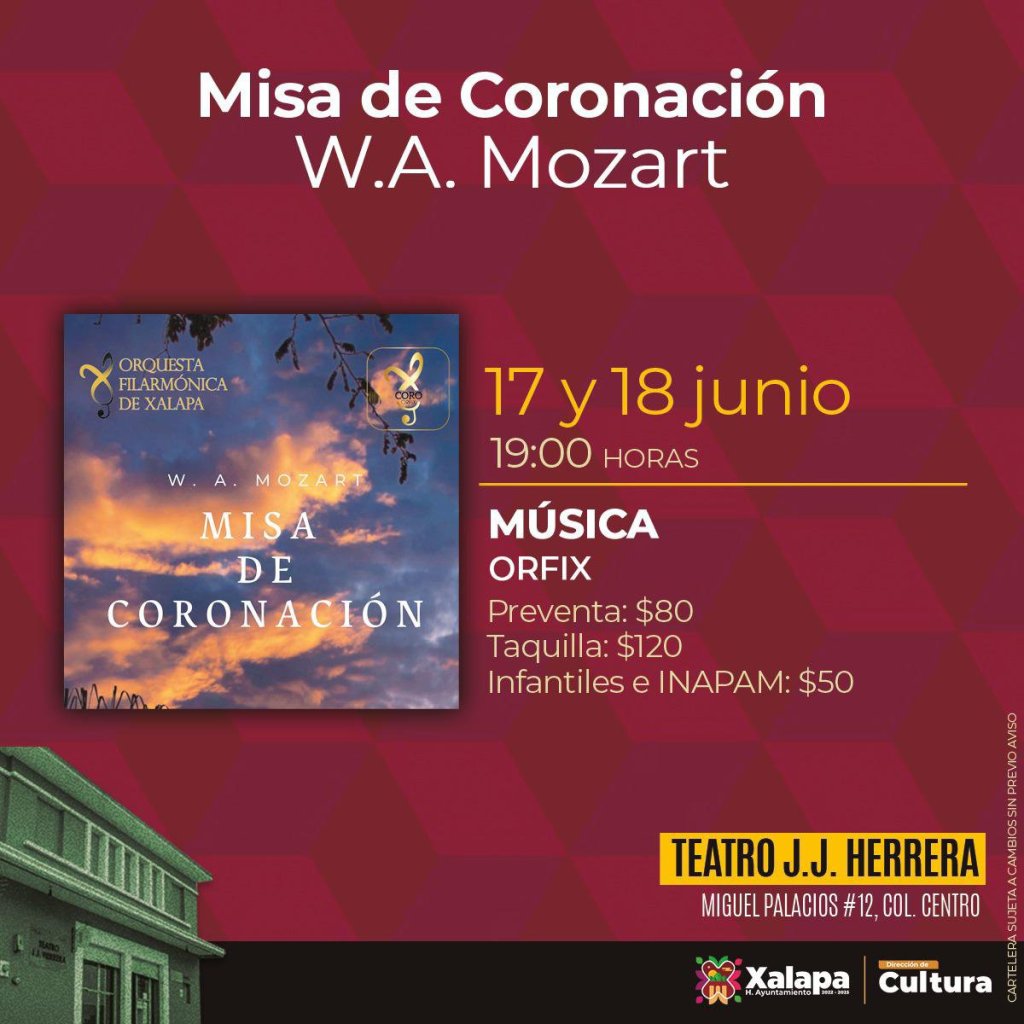 Adicionalmente, el 16 y 17 de junio a las 19:00 horas en el Museo de la Música Veracruzana está previsto el espectáculo artístico “El Edén de las musas”; y el 17 y 18 de junio en el mismo horario, pero en el Teatro JJ Herrera, la Orquesta Filarmónica de Xalapa (ORFIX), interpretará la “Misa de Coronación” de W.A. Mozart.