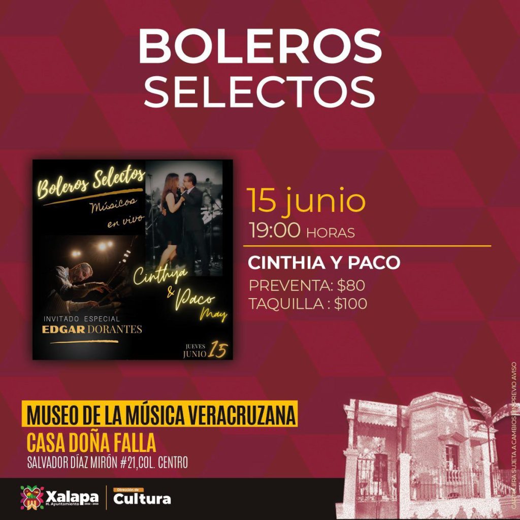 El 15 de junio a las 17:00 horas, el Grupo Tropical La Luna estará en las “Tardes de Xallitic”; a las 19:00 horas, la Banda Sinfónica del Gobierno del Estado presentará un espectáculo musical de mambos y danzones en el Auditorio del IMAC, y a la misma misma hora, pero en el Centro Recreativo Xalapeño, se proyectará el largometraje “Aya de Yopougon” como parte del Ciclo de Cine Africano; y en la Casa Doña Falla Cinthia y Paco interpretarán una sesión de “Boleros Selectos”.