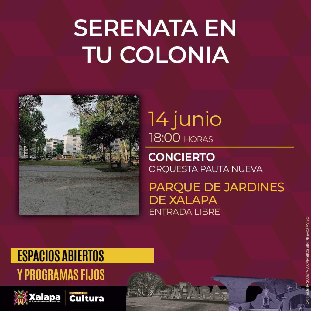 El 14 de junio a la 18:00 horas, las personas que habitan alrededor del parque de Jardines de Xalapa podrán escuchar a la Orquesta Pauta Nueva en una edición más del programa “Serenata en tu colonia”; y a las 19:00 horas, la Academia Clásica Popular se presentará en el Teatro JJ Herrera.