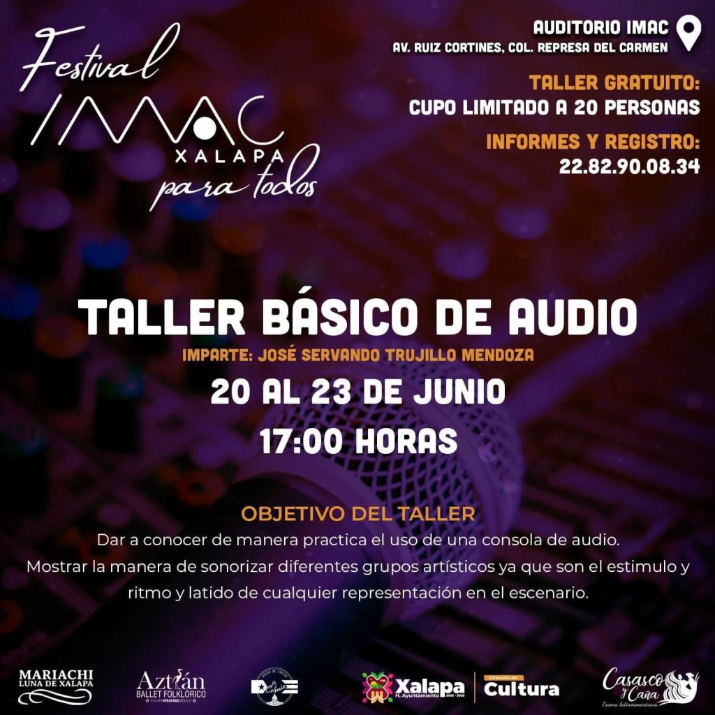 Otro de los cursos es el básico de audio, del 20 al 23 de junio a las 17:00 horas, para dar a conocer de manera práctica el uso de una consola de audio; y mostrar la manera de sonorizar diferentes grupos artísticos ya que son el estímulo, ritmo y latido de cualquier representación en el escenario.