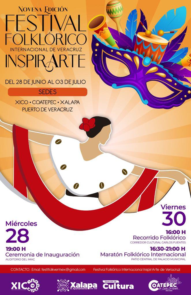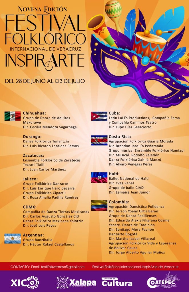A partir del próximo 28 de junio Xalapa se impregnará de la cultura, el folklore y las danzas de Cuba, Costa Rica, Haití, Colombia y Argentina; cuando dé inicio a la Novena Edición del Festival Folklórico Internacional de Veracruz Inspirarte, al que también se unirán compañías provenientes de los estados de Chihuahua, Durango, Zacatecas, Jalisco y la Ciudad de México.