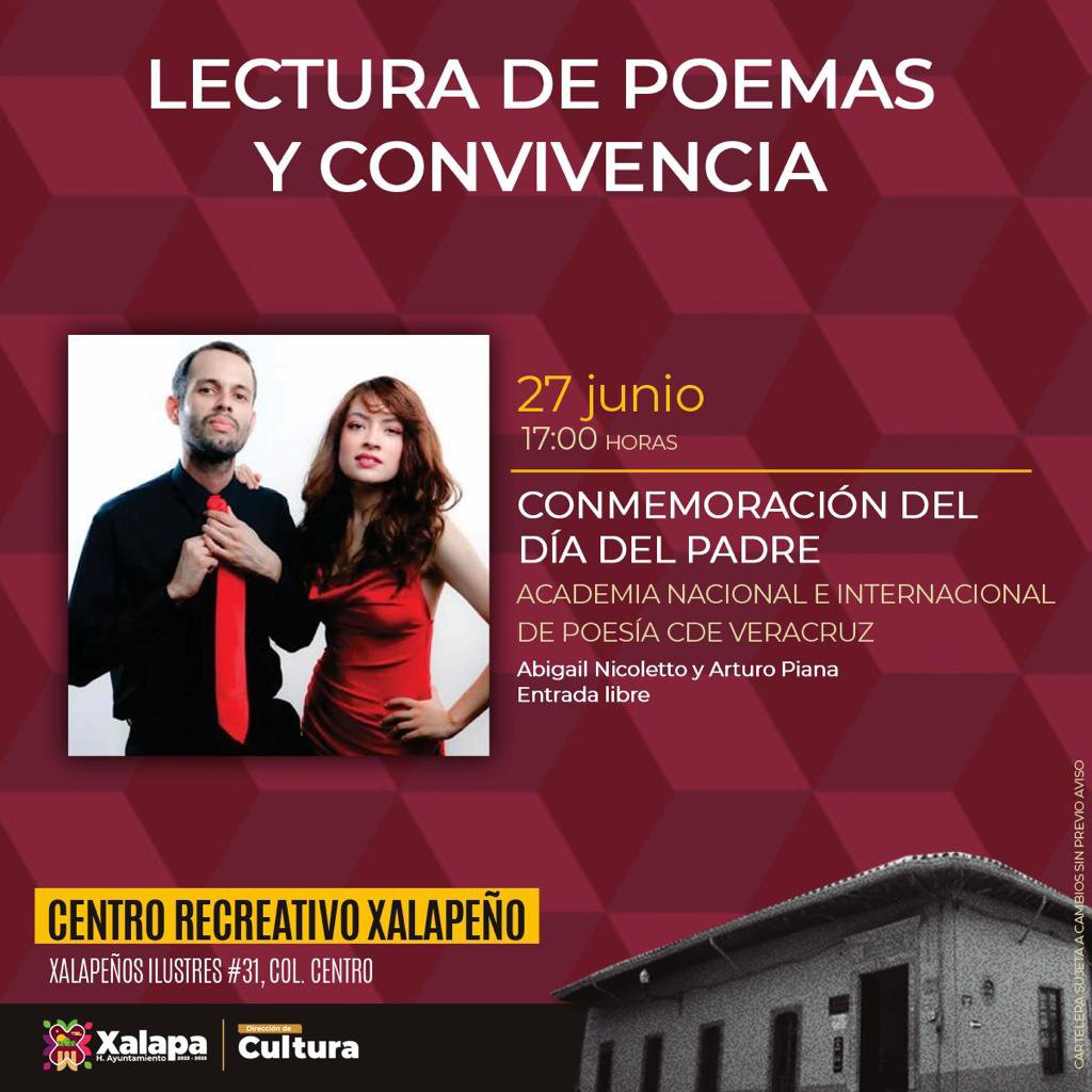 Mañana martes 27 de junio a las 17:00 horas en el Centro Recreativo Xalapeño, Abigail Nicoletto y Arturo Piana de la Academia Nacional e Internacional de Poesía CDE Veracruz estará conmemorando el Día del Padre con “Lectura de Poemas y Convivencia”; asimismo, a las 17:30 horas, la Orquesta Pauta Nueva llevará el 17º Concierto Didáctico a la Escuela Primaria Vespertina “Jesús García Corona”, y a las 18:00 horas en el Teatro JJ Herrera se trasmitirá el film “El Resplandor” (1890) de Stanley Kubrick, como parte del Cine Club “Movie- Martes”.