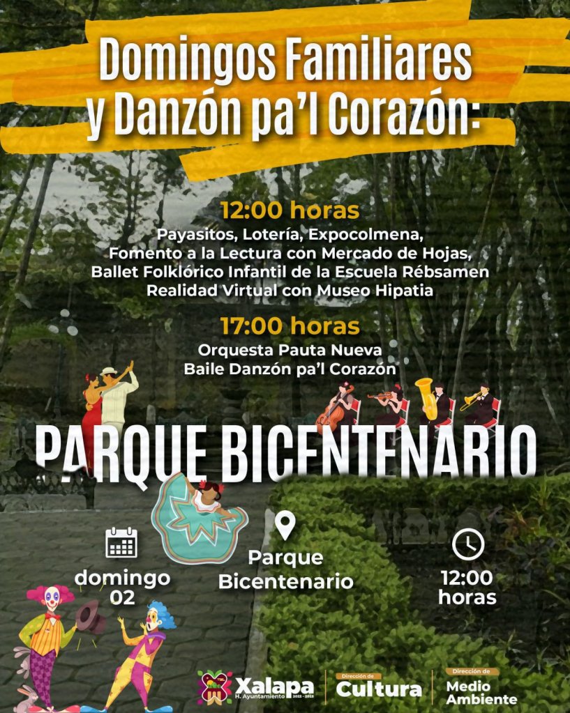 Para este domingo a las 12:00 horas en el parque Bicentenario está prevista la participación del Ballet Folklórico de la Escuela Rébsamen, con un programa especial que contempla show de payasitos, fomento a la lectura y lotería mexicana; seguido a las 17:00 horas de “Danzón pal´Corazón”.