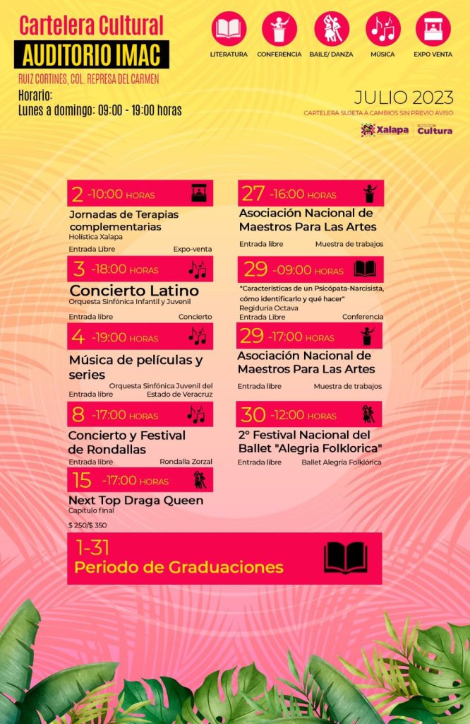 El martes 4 de julio a las 19:00 horas, al Orquesta Sinfónica Juvenil del Estado de Veracruz deleitará a los asistentes al Auditorio del IMAC con el espectáculo de Música de Películas y Series; el jueves 6 de julio a las 11:00 horas en el Teatro JJ Herrera, la beneficiaria de la Convocatoria de Estímulos a la Cultura 2022, Cindy Leyva, presentará el libro “DescoSER mis labios”; y a las 17:00 horas, Pasión Tropical amenizará las “Tardes de Xallitic”.