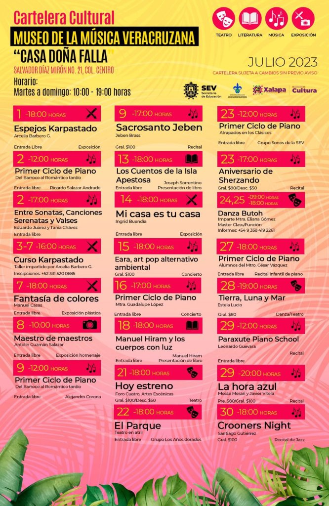 También a las 10:00 horas en el Auditorio del IMAC, Holística Xalapa realizará una expoventa y Jornadas de Terapias complementarias; a las 12:00 horas en el Teatro JJ Herrera se llevará a cabo el Concierto de Verano Jazz Cat 2023; y a la misma hora, pero en la Casa Doña Falla Museo de la Música Veracruzana será el Primer Ciclo de Piano “Del Barroco al Romántico tardío”. Asimismo, a las 17:00 horas está previsto el recital “Entre Sonatas, Canciones, Serenatas y Valses”.