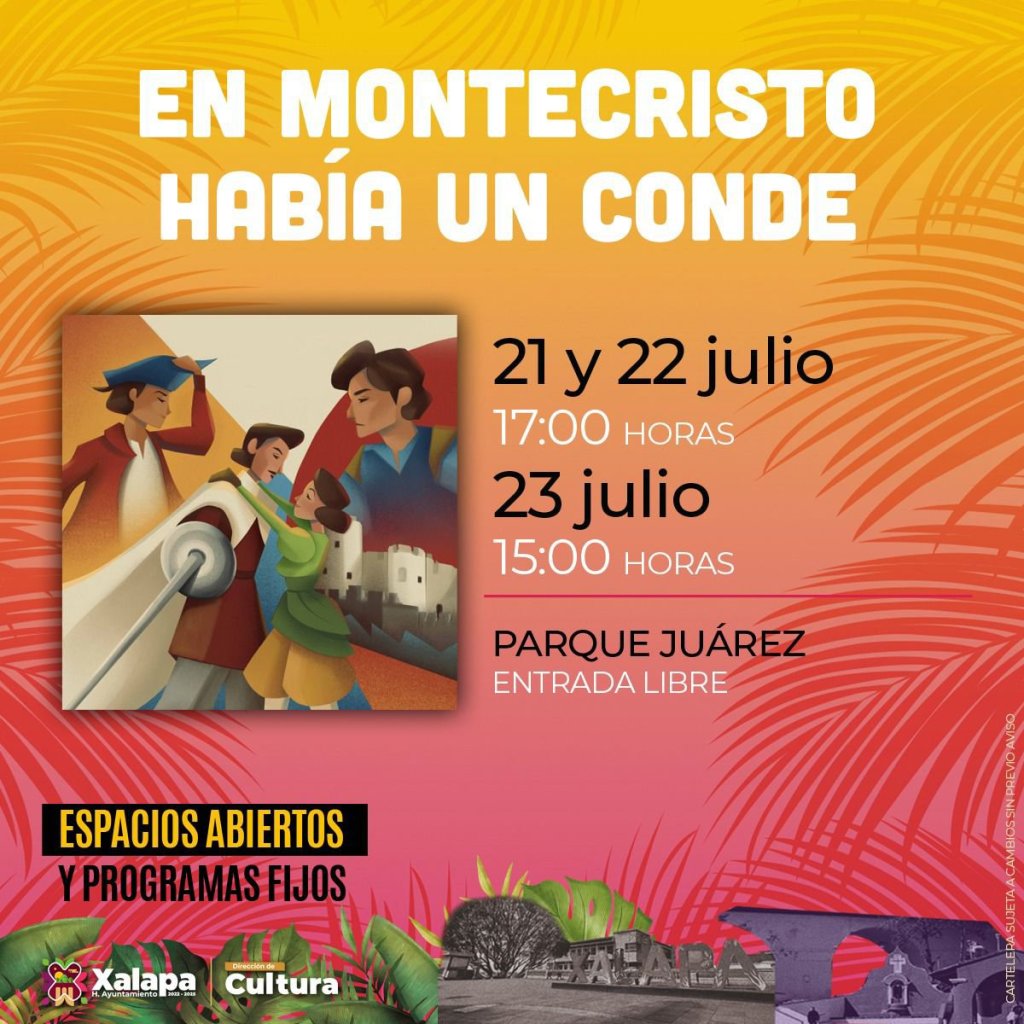 Para este día y sábado 22 a las 17:00 horas y el domingo 23 a las 15:00 horas en el parque Juárez, está pautada la puesta en escena «En Montecristo había un conde», la cuál permitirá adentrarse en una aventura llena de intriga, venganza y pasión, gracias al aclamado clásico literario ‘El Conde de Montecristo».
