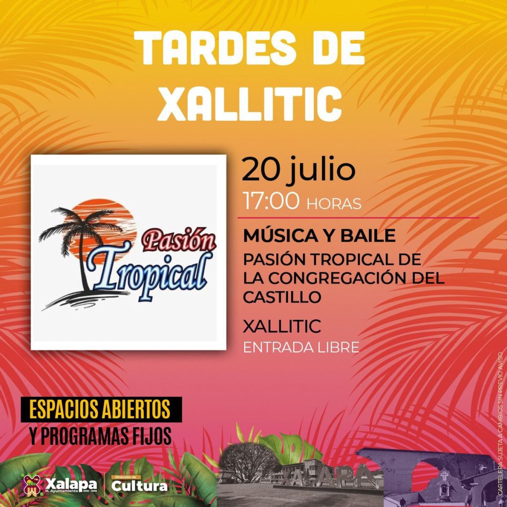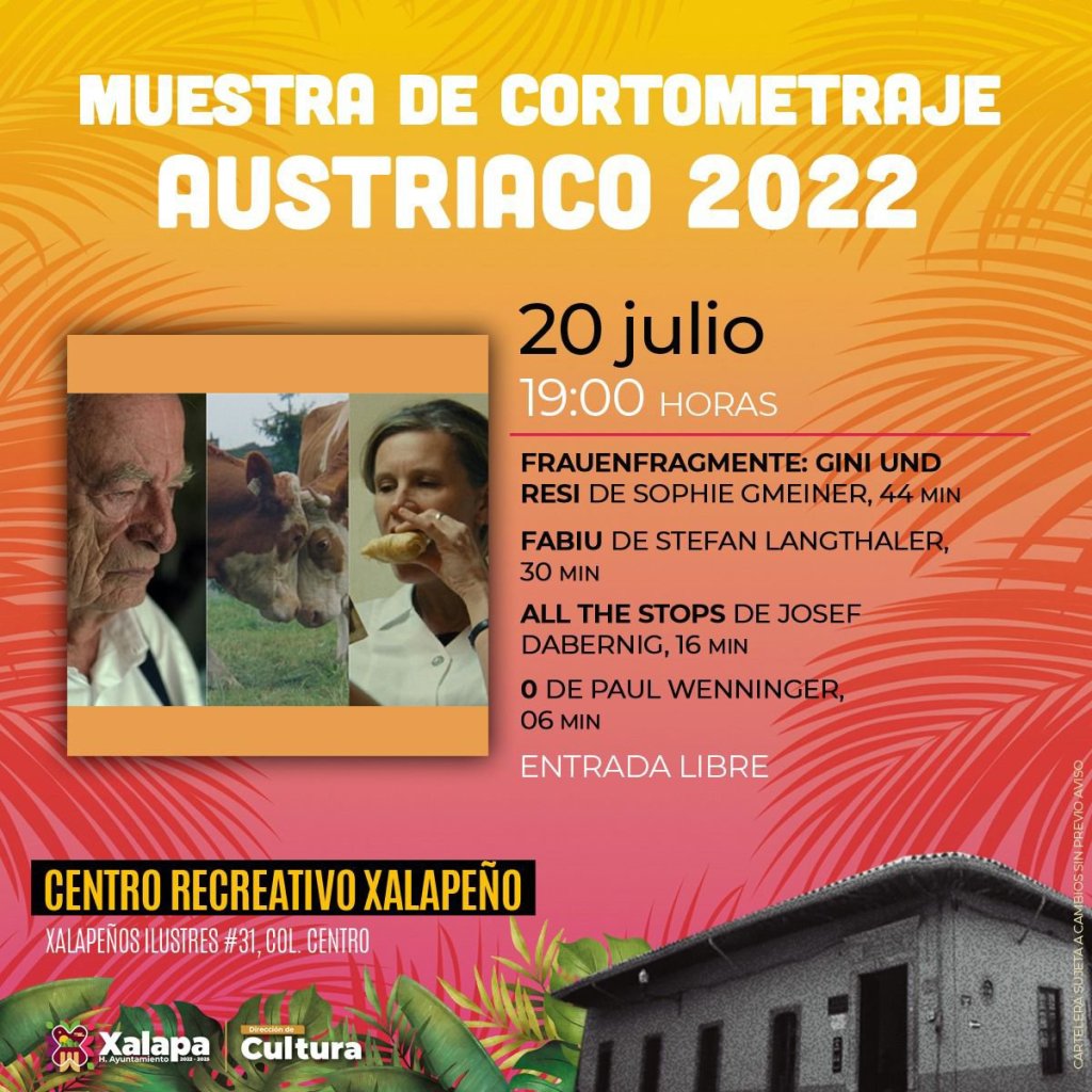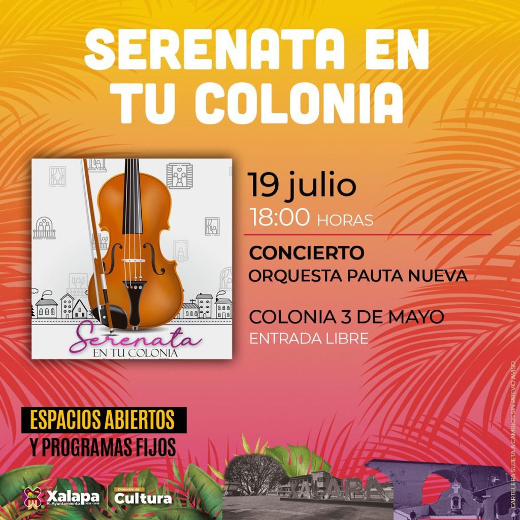 El miércoles 19 a las 18:00 horas, la Orquesta Pauta Nueva irá a deleitar con su música a los habitantes de la colonia 3 de Mayo; por su parte, el jueves 20 a las 17:00 horas, las «Tardes de Xallitic» vibrarán al ritmo de Pasión Tropical de la Congregación El Castillo; y a las 19:00 horas en el Centro Recreativo Xalapeño será el turno de la Muestra de Cortometraje Austriaco 2022 con la exhibición de cuatro cortometrajes.