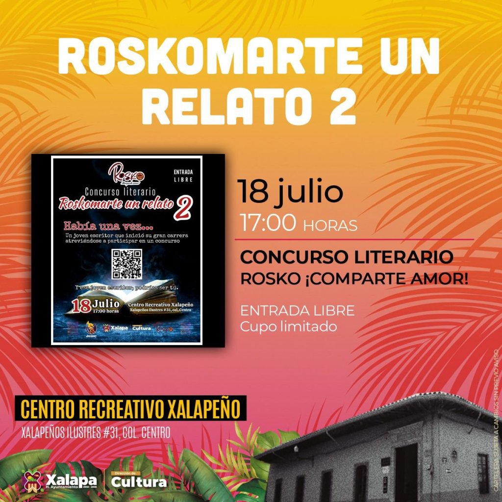 Entre tanto, el martes 18 de julio a las 17:00 horas se desarrollará el concurso literario «Roskomarte, un relato 2″en el Centro Recreativo Xalapeño; a las 18:00 horas la Orquesta Pauta Nueva llevará su serenata al Infonavit Loma Alta, y a la misma hora en la Casa Doña Falla Museo de la Música Veracruzana, Manuel Hiram presentará su libro «Manuel Hiram y los cuerpos con luz».