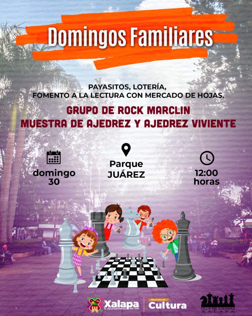 Dentro del programa de Domingos Familiares, que se llevará a cabo el 30 a las 12:00 horas en el parque Juárez, se presentará el Grupo de Rock «Marclin», además habrá una muestra de ajedrez y de ajedrez viviente, junto con un show de payasitos, lotería, y fomento a la lectura con mercado de hojas. Finalmente, a las 18:00 horas, Santiago Gutiérrez ofrecerá su recital de jazz «Crooners Night» en el Museo de la Música Veracruzana.