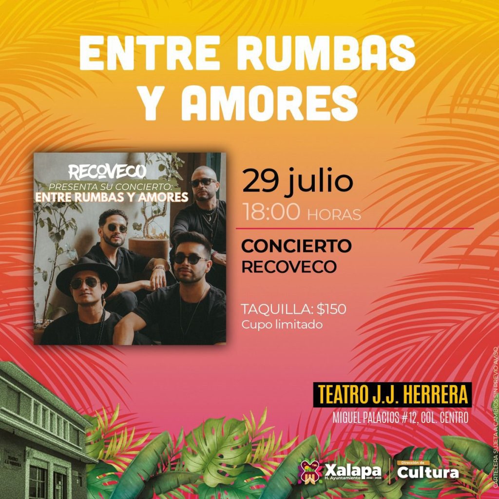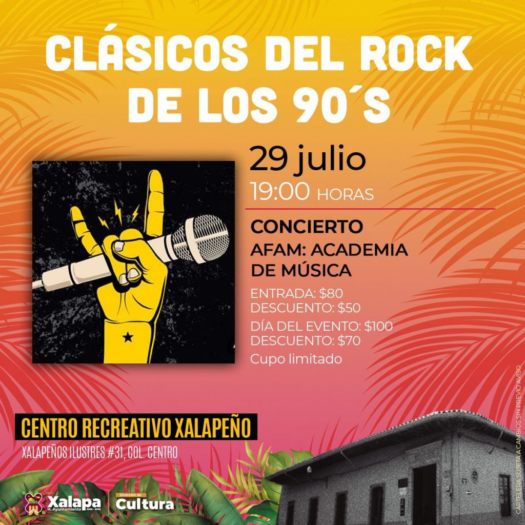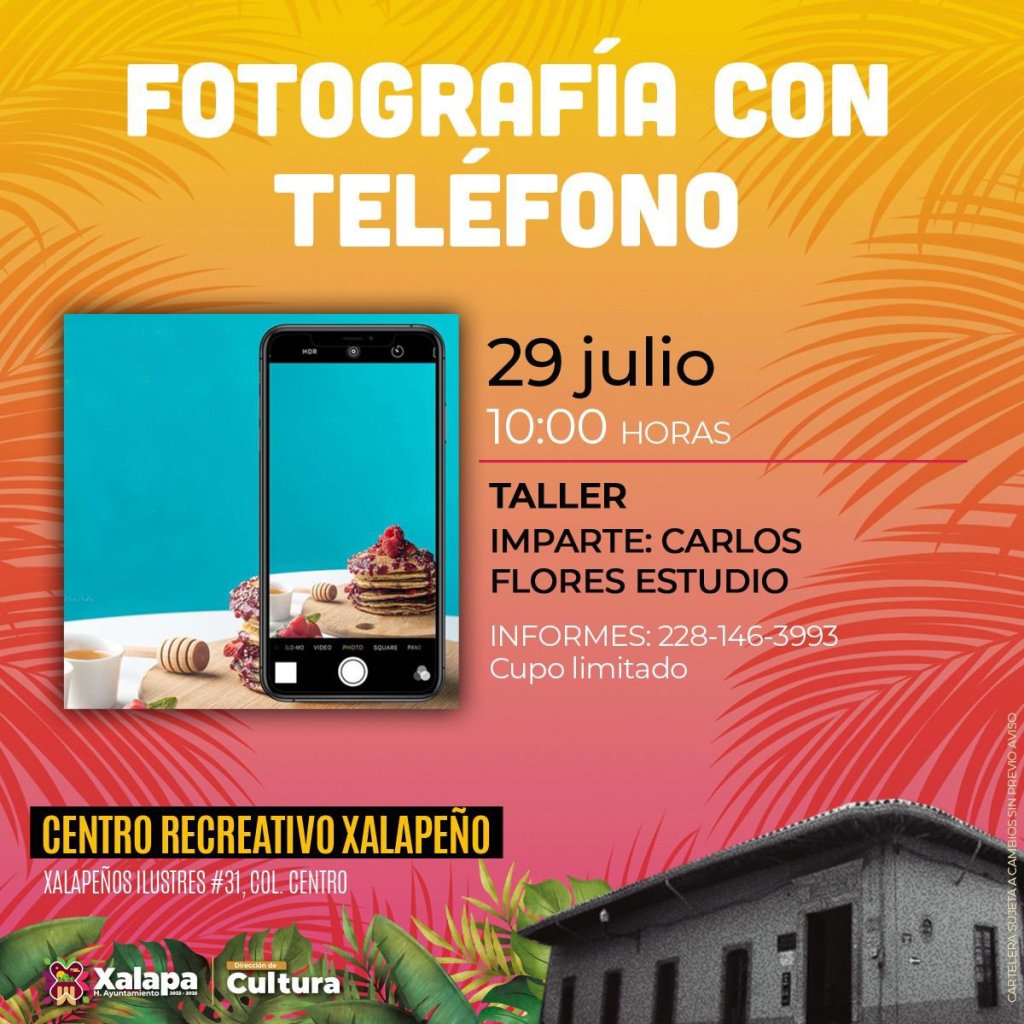 El 29 de julio a las 10:00 horas, Carlos Flores Estudio impartirá el taller «Fotografía con teléfono»; a las 18:00 horas en el Teatro JJ Herrera, Recoveco ofrecerá su concierto «Entre Rumbas y Amores»; y a las 19:00 horas, la Academia de Música AFAM hará un repaso por los Clásicos del Rock de los 90’s en el Centro Recreativo Xalapeño.