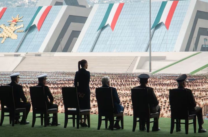 Claudia Sheinbaum y Andrés Manuel López Obrador, en un saludo a las Fuerzas Armadas de México, en el Colegio Militar de Tlalpan.