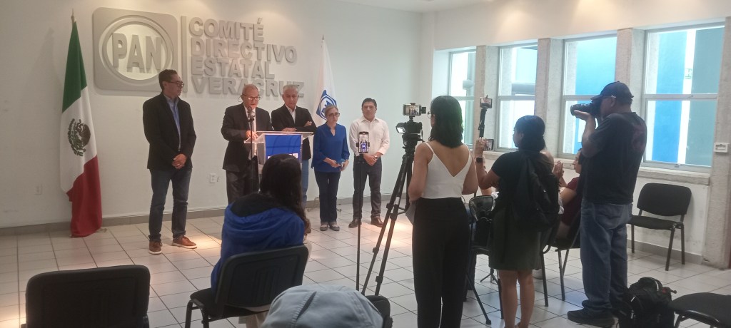 Presentes en la conferencia: Federico Salomón Molina, Presidente del Comité Directivo Estatal del PAN Veracruz; Arian Gabriel Hernández, Secretario de Acción de Gobierno del Comité Directivo Estatal del PAN Veracruz; Cristina Pérez Silva