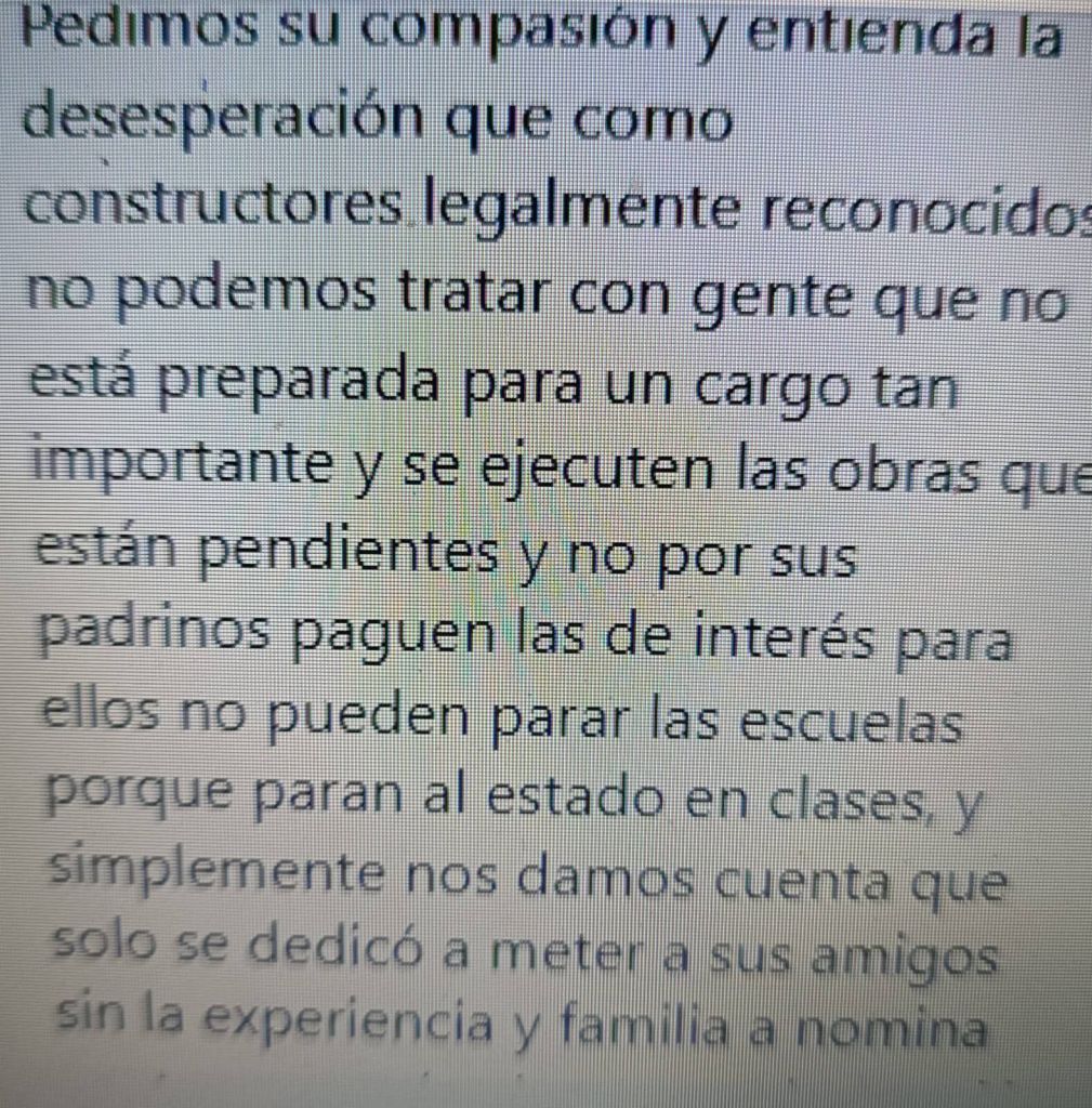 El sector constructor calificó de insostenible la situación: “No se puede seguir operando con personal sin experiencia ni capacidad técnica. Se metió a familiares y amigos a la nómina, pero las obras no avanzan y las escuelas no pueden seguir esperando. Si se paran los planteles, se paraliza el estado”, sentencian.