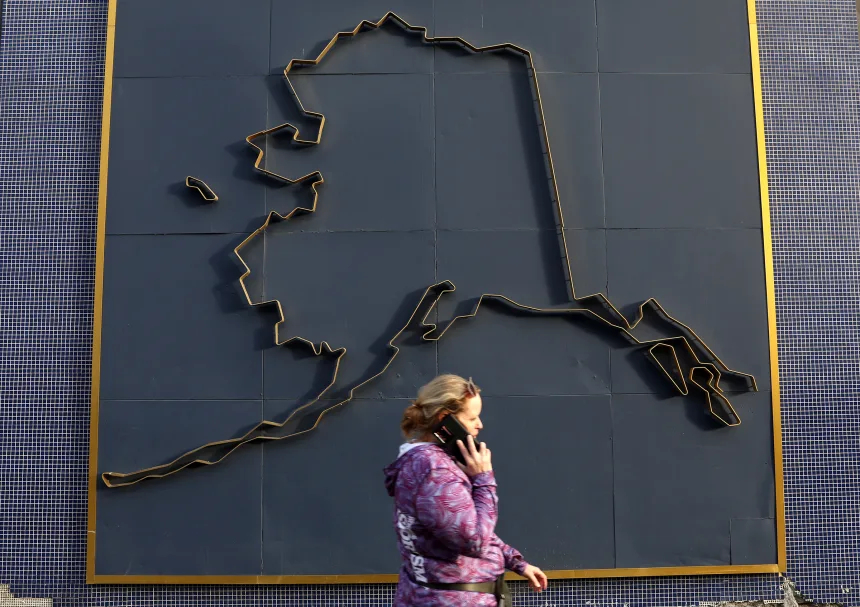 Una mujer habla por teléfono mientras camina junto a un mapa de Alaska el 9 de julio de 2022 en Anchorage, Alaska. Justin Sullivan/Getty Images