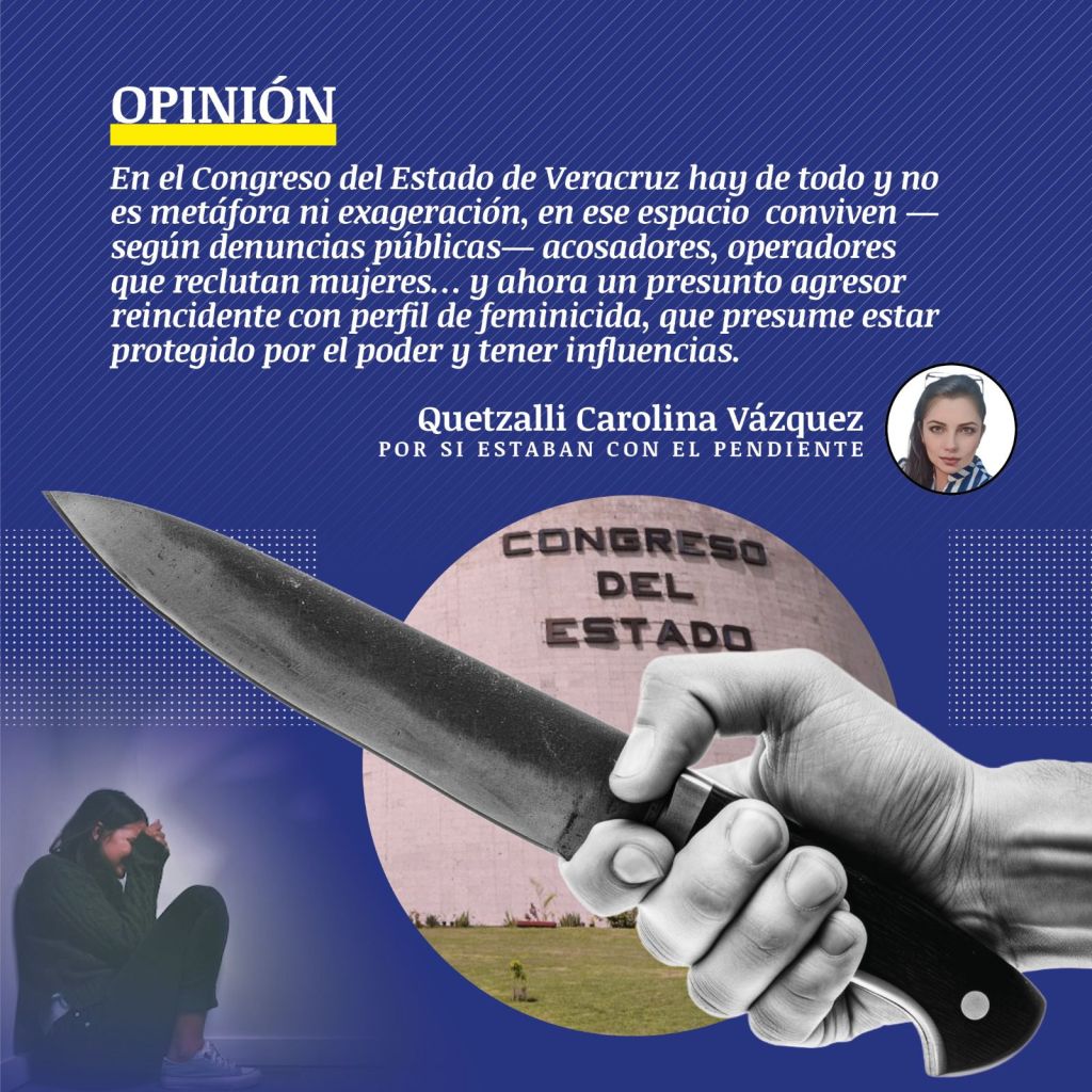Quetzalli Carolina Vázquez | En el Congreso del Estado de Veracruz hay de todo, y no es metáfora ni exageración: en ese espacio conviven —según denuncias públicas— acosadores, operadores que reclutan mujeres y ahora un presunto agresor reincidente con perfil de feminicida, que presume estar protegido por el poder y tener influencias.