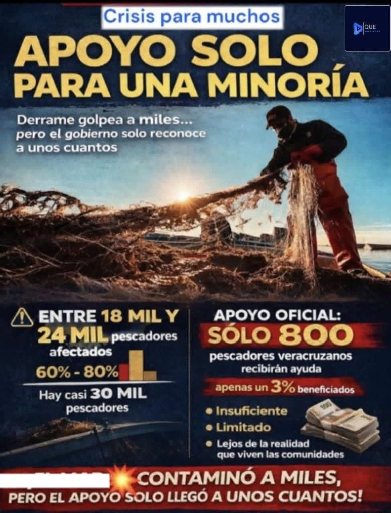 Ante la magnitud del problema, el Gobierno Federal anunció apoyos para 3,679 pescadores, pero en Veracruz —uno de los estados más afectados— solo 800 recibirán el beneficio de 15 mil pesos que les serán entregados a través de Bienpesca.